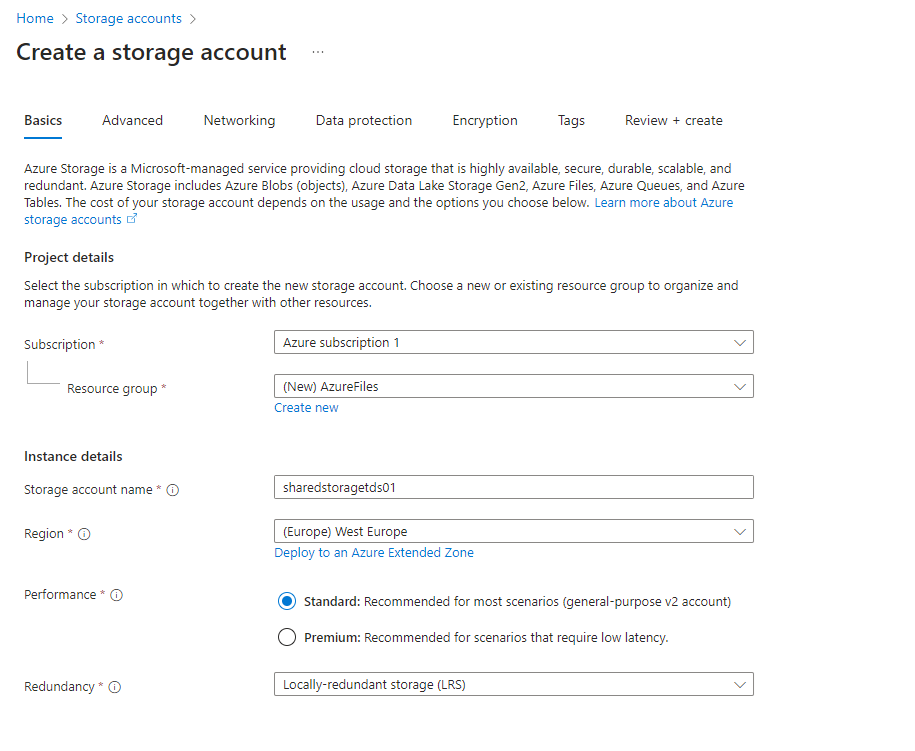 • Vytvoření instance Azure Files: Po vytvoření úložného účtu přejděte na jeho přehledovou stránku a v levém menu vyberte „File shares“. Klikněte na „+ File share“ a zadejte název a velikost kvóty pro nové sdílení