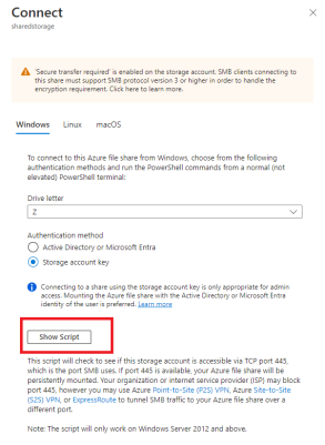 Připojení k Azure Files: Po vytvoření sdílení souborů klikněte na jeho název pro zobrazení podrobností. Vyberte „Connect“, abyste získali příkazy pro sdílení Azure Files ve Vašem Windows či jiném OS.